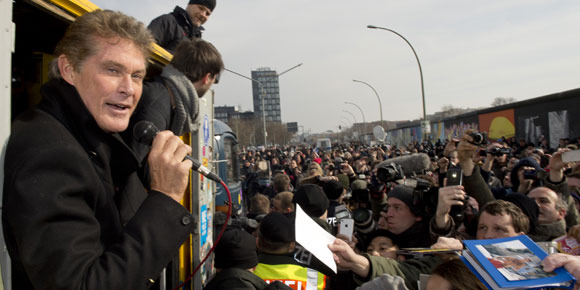 Mieux que les Pink Floyd et leur « Another Brick In The Wall », Hasselhoff a scandé un magnifique “SAVE THE WALL” hier dans la capitale allemande. Désireux de montrer son soutien aux opposants à la destruction du mur, il a dégainé le brushing impeccable pour faire bonne impression. Selon les médias, il aurait déclaré que « les vestiges du mur sont un morceau d’histoire ». Bonne pub donc pour Hasselhoff qui a vu la foule s’enflammer en criant des DAVID WE LOVE YOU. Le beau gosse de 60 ans qui en parait 75 a ensuite poussé la chansonnette en évitant soigneusement de trop rider son visage jaune « urine » et légèrement botoxé.