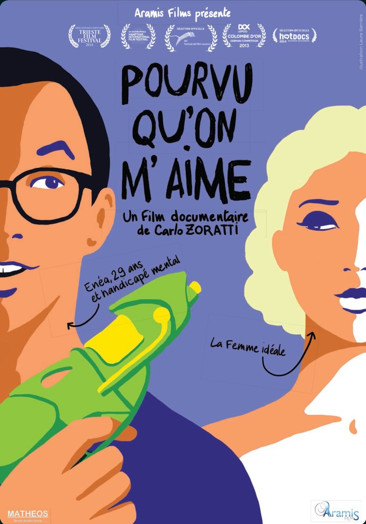 Un film de Carlo Zoratti avec Enea Gabino, Alex Nazzi et Carlo Zoratti. Italie/Allemagne. 2013. 1h24. Couleur. 1.85. SRD. L’histoire Enea, italien de 29 ans, autiste et déficient mental, cherche la femme de sa vie ! Ses deux meilleurs amis décident de l’aider à réaliser son rêve. L’avis Ce premier film est mi fiction-mi documentaire, mais les parties les plus intéressantes sont celles documentaires. La fiction, mal construite, n’est qu’un faux prétexte pour nous faire découvrir la solitude sentimentale d’Enae. Trop « bidouillée » elle enlève toute émotion. Les amis d’Enea veulent lui faire perdre sa virginité, mais lui c’est une grande histoire d’amour qu’il veut vivre. Le titre français exprime mieux cette envie d’Enea que le titre original « The Special Need » qui manque réellement de poésie. Enea est un acteur né et il arrive formidablement à se plier, un peu trop, aux désidérata de Carlo Zoratti ; il est quand même touchant quand il refuse d’aller chez les putes, ou quand il reçoit les caresses et en donne à cette assistante sexuelle dans une maison spécialisée en Allemagne. Le cœur du film est là : comment un handicapé peut vivre sa sexualité ! Le film étant construit comme un road movie tout doit aller vite, et on aurait aimer rester plus longtemps sur certaines scènes comme celles avec la psychothérapeute, ou les échanges pudiques et sensuelles avec l’assistante sexuelle. Tout le hiatus qui existe dans le film vient qu’à force de montage, la crédibilité et la sincérité du propos en pâtie. Mais l’important c’est que « Pourvu qu’on m’aime » existe et qu’il mérite d’être vu pour mieux comprendre les aspirations sentimentales d’un être qui a sa vision décalée du monde par rapport à la notre. Un film d’utilité publique. Pourvu Qu’on M’aime Pourvu Qu’on M’aime Bande-annonce VO Partager :Tweet Laisser un commentaire Annuler la réponse Votre adresse e-mail ne sera pas publié.CommentaireNom* Email* Site Web Oui, ajoutez moi à votre liste de diffusion. Prévenez-moi de tous les nouveaux commentaires par e-mail. Prévenez-moi de tous les nouveaux articles par email.