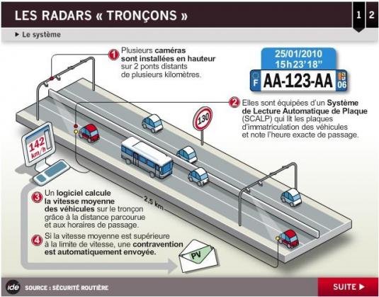 D’après la sécurité routière, ces radars « intelligents » seront « prioritairement déployés sur des portions de route où une vitesse excessive est particulièrement accidentogène comme les rétrécissements de voie, les franchissements de tunnel et de pont, ou les successions de virages. Ils contrôleront l’ensemble des véhicules sur la section équipée afin d’identifier les véhicules en infraction. Ces nouveaux radars ne +flashent+ pas, car ils fonctionnent à partir d’un système infra-rouge »