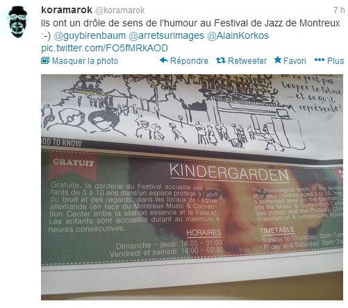 La photo figure en dernière page du numéro de Samedi du journal, tiré tout de même quotidiennement à 2 000 ou 3 000 exemplaires à Montreux pendant les concerts. En dessous on peut lire notamment « gratuite, la garderie du Festival accueille vos enfants de 3 à 10 ans dans un espace protégé, à l’abri du bruit et des regards… » Plutôt flippant lorsqu’on connaît la tragédie de cet enfant.